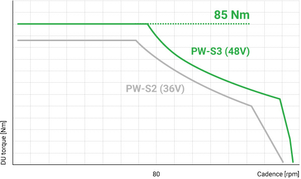 Higher torque (by approx. 10 Nm) at 80 rpm and above achieved with 48V expansion