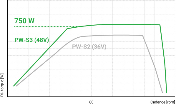 Higher power (by approx. 10%) at 80 rpm and above achieved with 48V expansion