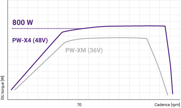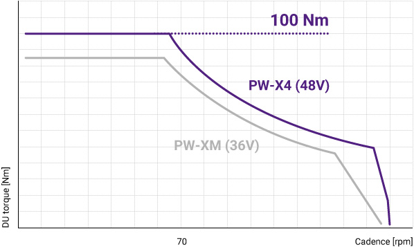 Higher torque (by approx. 10 Nm) at 70 rpm and above achieved with 48V expansion
