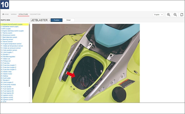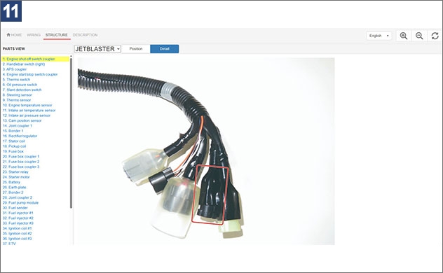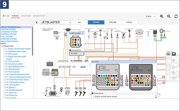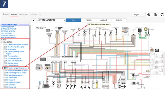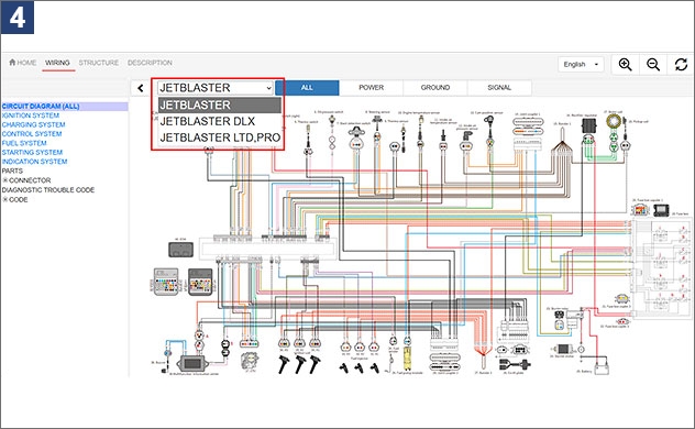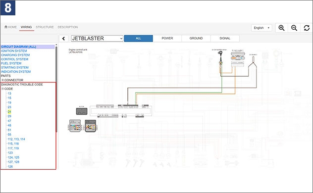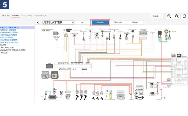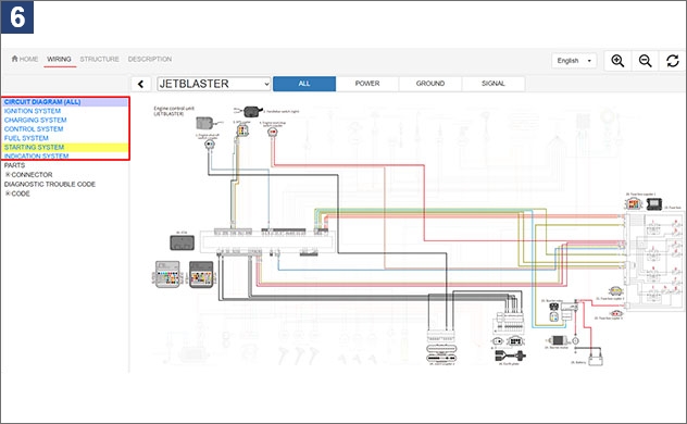 1. À l’écran de recherche de manuels d’entretien du portail d’entretien, saisissez le nom ou le numéro du modèle.2. Exemple : lorsque vous recherchez F5R* 3. Une fois le schéma de câblage avancé sélectionné, l’écran d’accueil s’affiche. Voir l’image ci-dessous. Quatre langues sont disponibles à partir du menu déroulant dans le coin supérieur droit : japonais, anglais, français et espagnol.4. Cliquez sur l’onglet WIRING (câblage) afin d’afficher le schéma de câblage pour le modèle sélectionné. S’il y a plusieurs variations de modèle, sélectionnez-en un. 5. Les schéma de câblage comporte des options d’affichage sélectionnables pour ALL (tout), POWER (alimentation), GROUND (terre) et SIGNAL (signal). Exemple : lorsque vous sélectionnez POWER (alimentation)6. Vous pouvez afficher le schéma de câblage pour chaque système en en sélectionnant un à partir de la barre de menu à gauche. Exemple : lorsque vous sélectionnez STARTING SYSTEM (système de démarrage)7. En sélectionnant des composants, vous pouvez identifier l’emplacement de chaque composant. Exemple : lorsque vous sélectionnez le capteur de température du moteur8. Sélectionner un code d’erreur permet d’afficher le câblage, les composants et les coupleurs associés. Exemple : lorsque vous sélectionnez DTC249. Afin de visualiser les détails concernant un coupleur spécifique, cliquez sur le coupleur afin de voir le numéro et les couleurs de ses fils, ainsi que les informations concernant les composants raccordés. Exemple : lorsque vous sélectionnez le coupleur APS10. L’onglet STRUCTURE affiche les positions des composants et des coupleurs au moyen de photographies ou d’illustrations du véhicule. Exemple : lorsque vous sélectionnez le coupleur de l’interrupteur de mise hors tension du moteur11. Appuyer sur Detail (détail) permet d’afficher les détails des composants ou coupleurs sélectionnés.