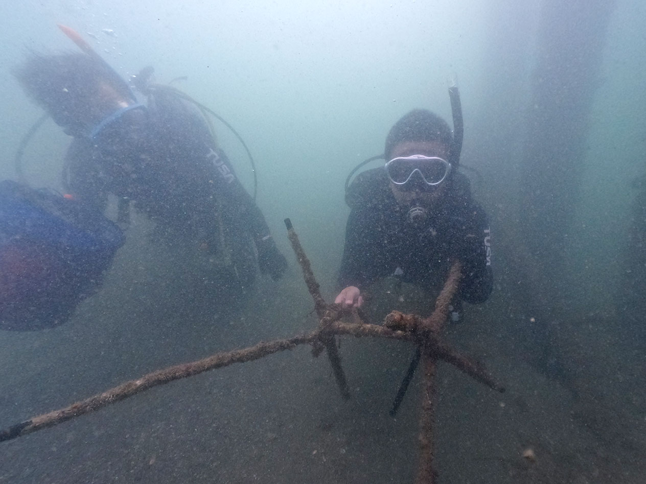 Le jour J, l'opération a été menée par 13 membres : 5 à terre et 8 sous l'eau, appuyés par deux bateaux de sauvetage, dont un patrouilleur fourni par la Fondation environnementale intégrée du lac Hamana. La visibilité, avec une profondeur maximale d'environ 5 mètres, était assez mauvaise, rendant difficile l'observation des alentours. Malgré cela, en trois plongées, nous avons réussi à ramasser 49 kg de déchets, notamment des leurres, des hameçons, des cannes à pêche, des seaux et des chaises probablement emportés par le vent.