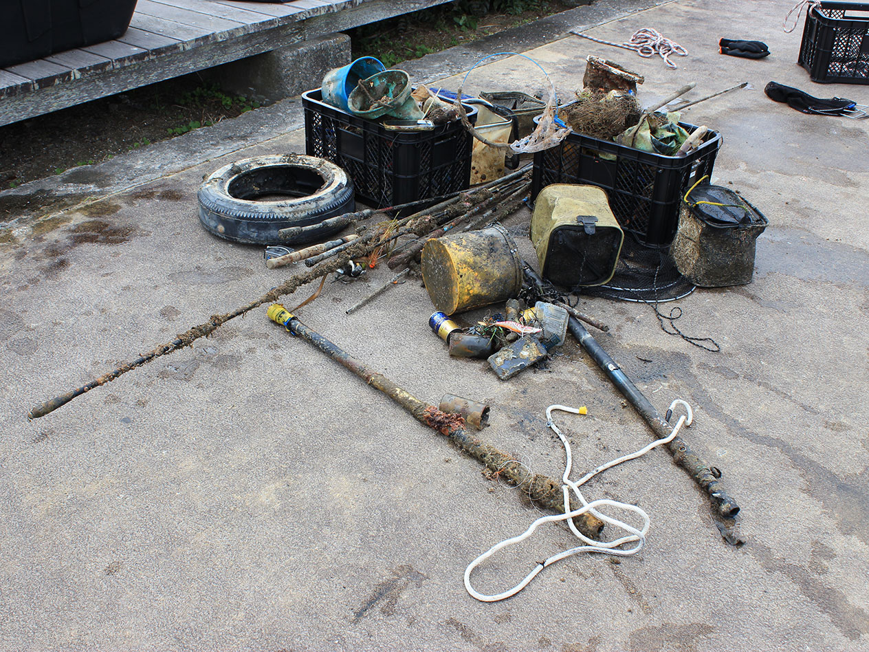 Sous l'eau, nous avons constaté que de nombreuses zones présentaient des traces typiques d'encombrement. Bien que nous n'ayons pu intervenir qu'autour du premier quai cette fois-ci, nous avons réussi à ramasser plus de déchets que prévu. Le plomb et le plastique utilisés dans les engins de pêche contribuent à la pollution marine. S'ils sont visibles, on peut les ramasser, mais il existe inévitablement des endroits inaccessibles car ils sont cachés. Nous avons estimé que ces zones nécessitent une attention et une protection accrues.