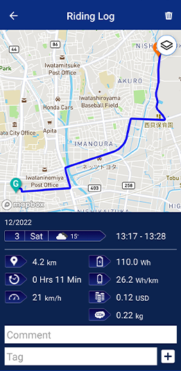 A riding log is automatically generated for each ride, where can check your traveled route and other data.
