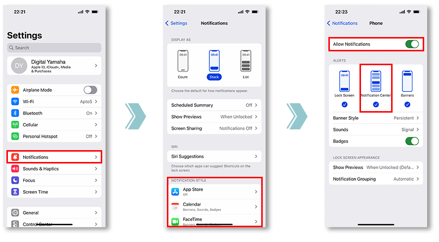 Notification settings for various apps