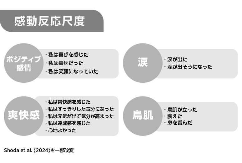 立命館大学との共同研究では、日本人4690人を対象に「どのような体験で」「どのように感動を」「どれくらい感じているか」を調査し、その「感動」がどのような体験だったかを測定することができる「感動反応尺度」を開発。感動反応尺度は、「幸せだった」「すっきりした気分になった」といった心の動きと、「涙が出た」「鳥肌がたった」といった身体の変化の2軸で構成されており、計11種類の感動時の心身反応を33項目で測定することができる尺度となっている。