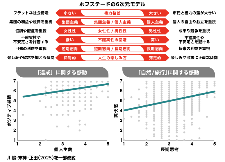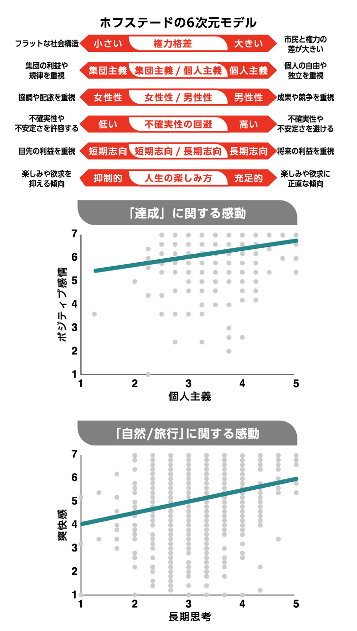 その結果、感動の種類によって、文化と感動には関連があることが分かってきた。 まず「達成」に関する感動を見てみると、ホフステードの文化特性尺度のうち「個人主義」と感動体験尺度の『ポジティブ感情』に相間が見られ、「個人主義傾向が高い人ほど、達成に関する感動ではポジティブ感情を抱きやすい」ということが示唆された。さらに「自然 / 旅行」に関する感動を見てみると、ホフステードの文化特性尺度の「長期志向」と感動反応尺度の「爽快感」に相間が見られ、「『長期志向』が高い人ほど、『爽快感』を感じやすい」ということも示唆された。 今回は国内データのため確定的な結論を導くことはできないが、これらの結果から「アメリカやオーストラリアといった『個人主義』が高い文化圏では、『努力の末に達成した』というストーリーが『ポジティブな感情』を喚起するかもしれない」といったことや「日本や中国など『長期志向』が高い文化圏では、『自然や旅行』といった非日常的な場面で『感情を解放する』ようなストーリーが『爽快感』を喚起しやすいだろう」といったことが考察できる。
