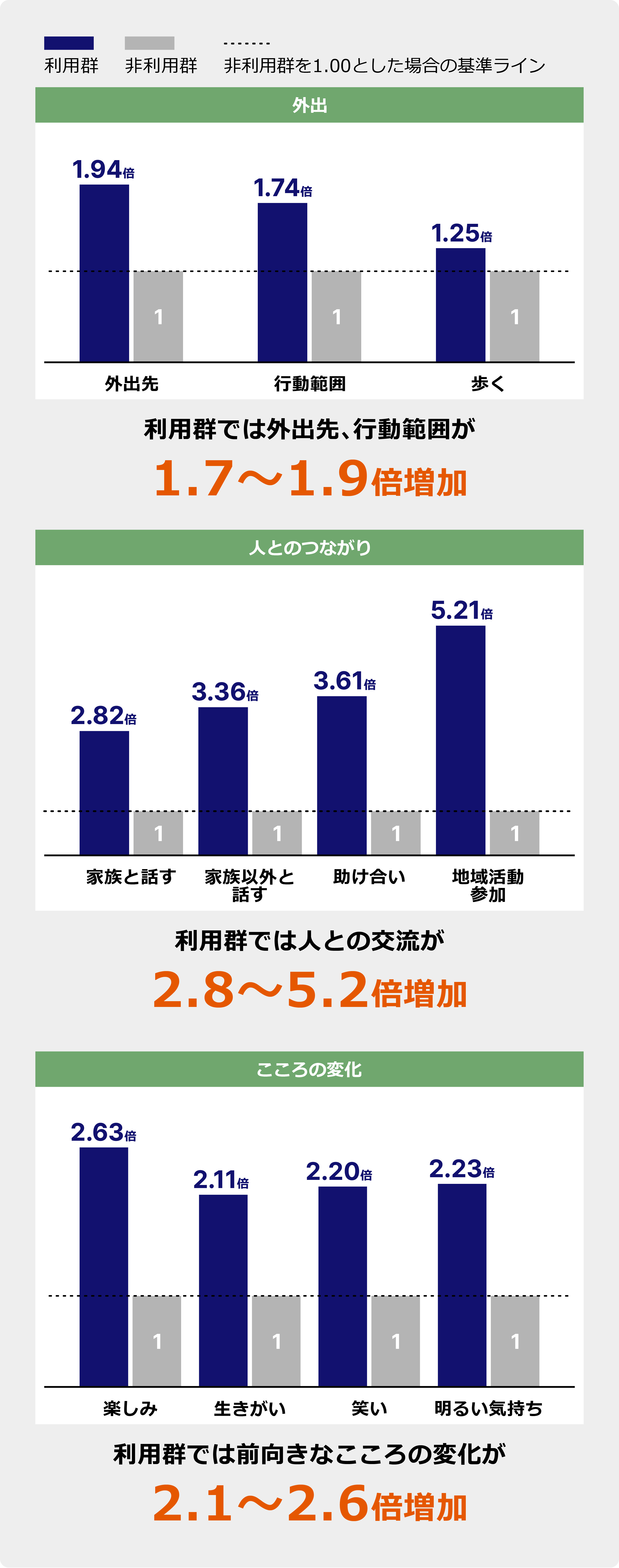 ヤマハ発動機と千葉大学の共同研究では、グリーンスローモビリティを導入した地域において、外出機会や地域活動への参加の増加、前向きなこころの変化が確認されています*5。