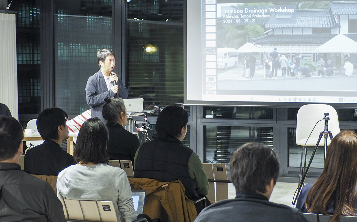 三島さんが各地で実践するのは、こうした環境再生のワークショップたち。鳥取県江府町では屋根から落ちる雨を排水するのではなく地面に浸透させる昔の知恵を、瓦や藁、竹といった地域にある材料を使って再現。和歌山県田辺市の学校では、子どもたちが校庭作りをカリキュラムの一環として体験し、竹を使った暗渠づくりや植物のフェンス作りに取り組みました。