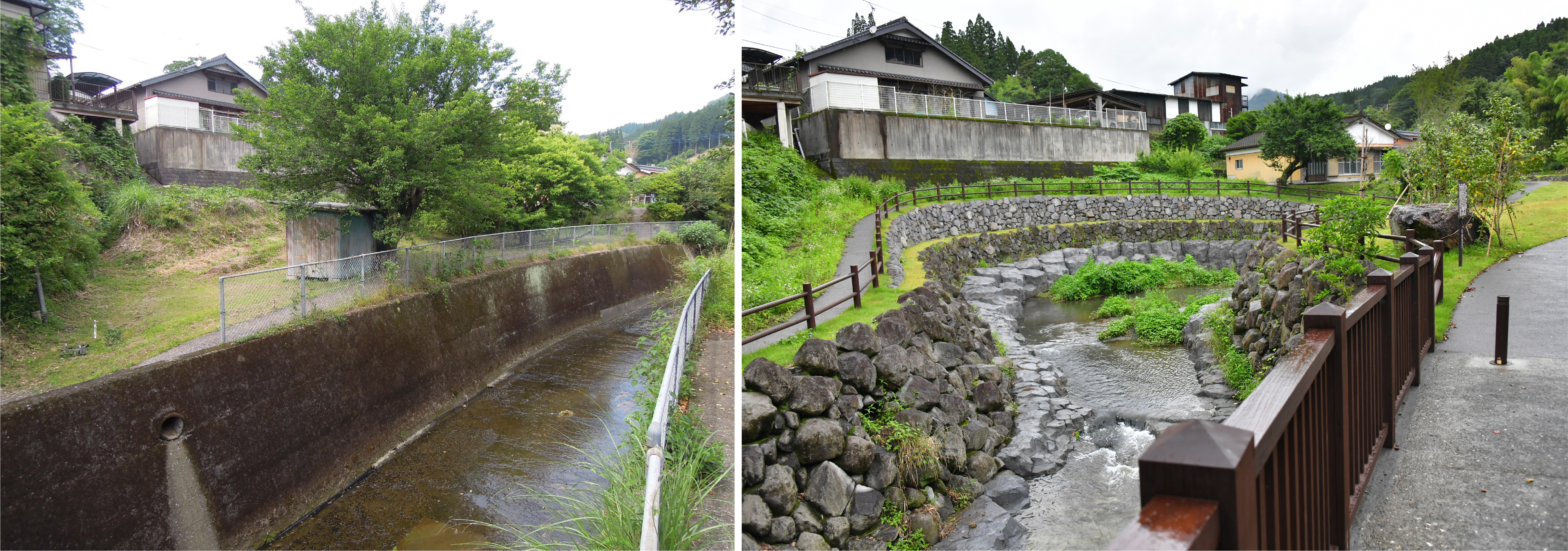 左:整備前/右:整備後。かつての流路に合わせて大きく蛇行する形へと復元された。提供:宮崎県