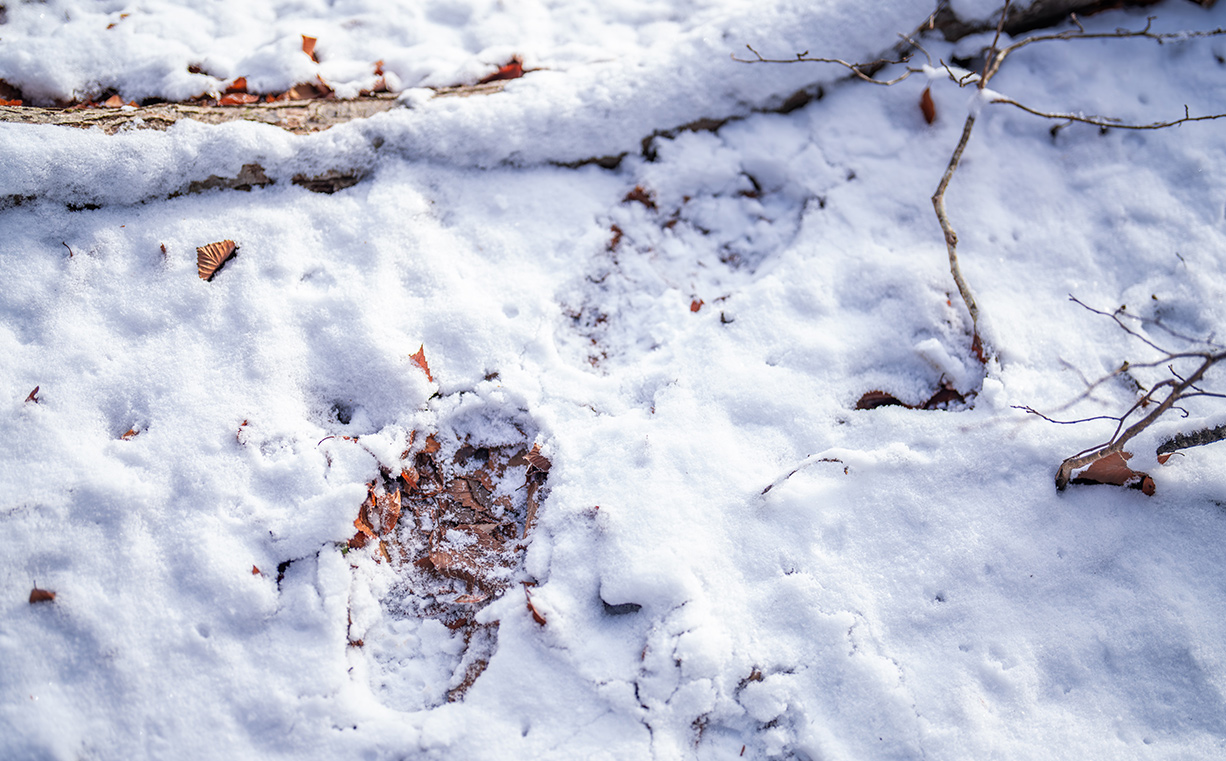 忍び猟の時は大体こんな感じですね。こういうところで雪の上に残った足跡とか、まだ湯気の残る糞とか、かじられたばかりの葉っぱを見つけると、「獲物が近いぞ!」って感じでテンションが上がるんです。