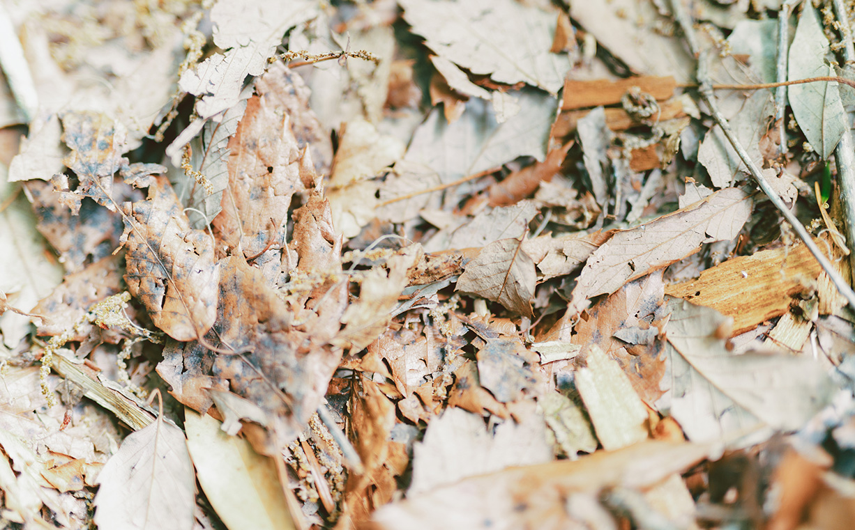 たとえば、落ち葉。表面の網目模様は腐生菌のコロニーで、今まさに木の成分を分解して土に返している最中です。分解には2〜3年かかりますが、菌糸が落ち葉をしっかり固定するので、雨に流されることはありません。健全な森では、この菌糸ネットワークと「水みち」が連動して、保水と分解が同時に行われています。