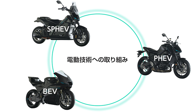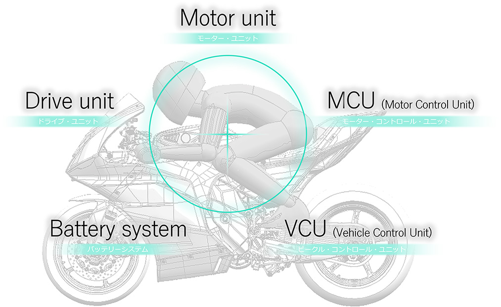 ライダーがFUNを感じられるBEVを実現するために、次の4つの要素で研究開発を進めています。最もこだわったのは「軽量コンパクト」であること。また、内燃機関の車両で培ってきた技術を活用し、バッテリーの形状や各コンポーネントのレイアウト最適化によって「ヤマハらしい操縦安定性」を追求しています。そして、「強烈な加速とシームレスで扱いやすいトルク」と、スポーツ走行への集中を可能にするシンプルでわかりやすい「HMI(ヒューマン・マシン・インターフェイス)」です。