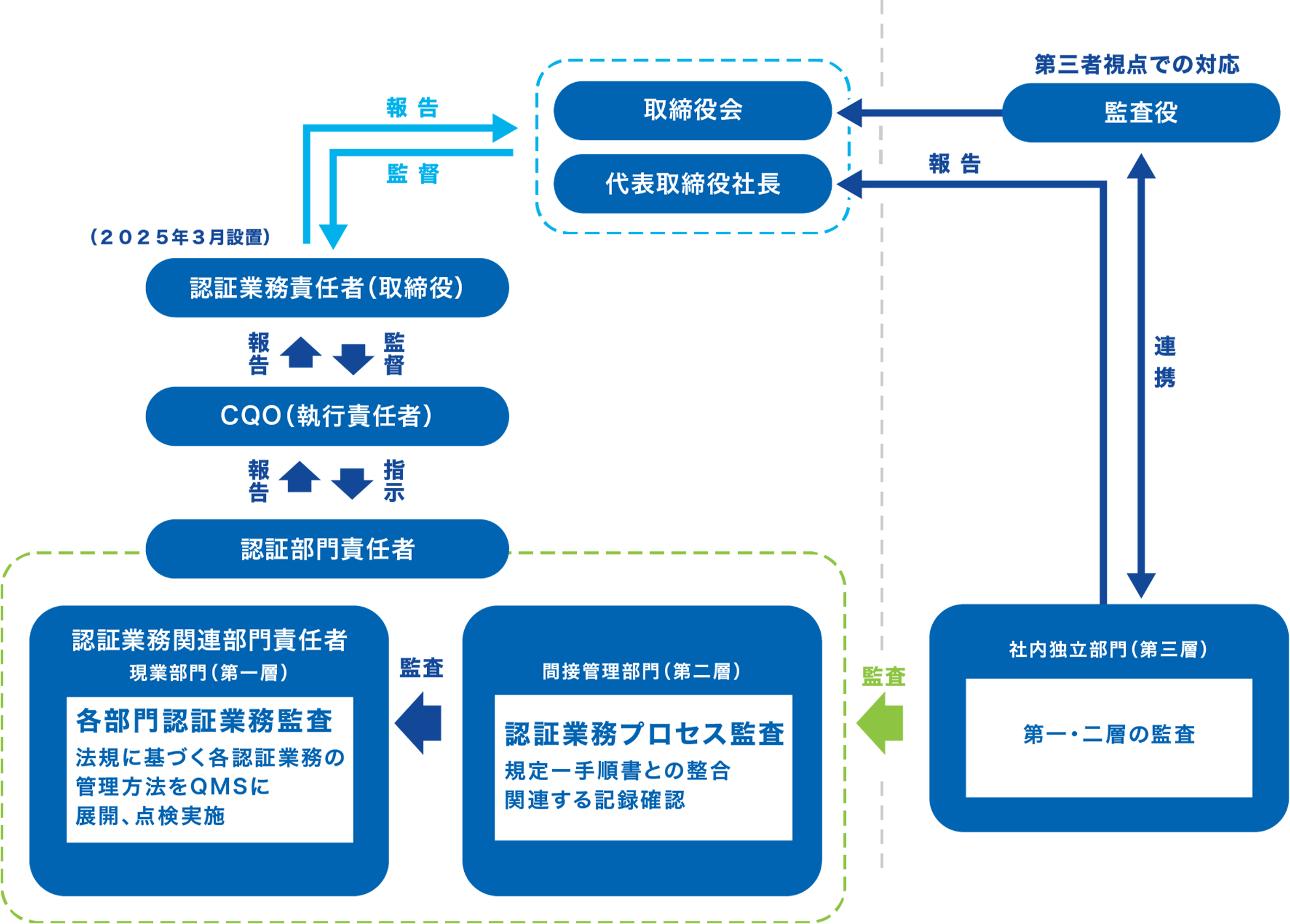 実務を行う現業部門(第一層)を管理部門(第二層)が監査し、社内独立部門(第三層)が現業部門・管理部門の監査実施内容の確からしさを監査、改善することで、認証業務全体の品質向上を図ります。
