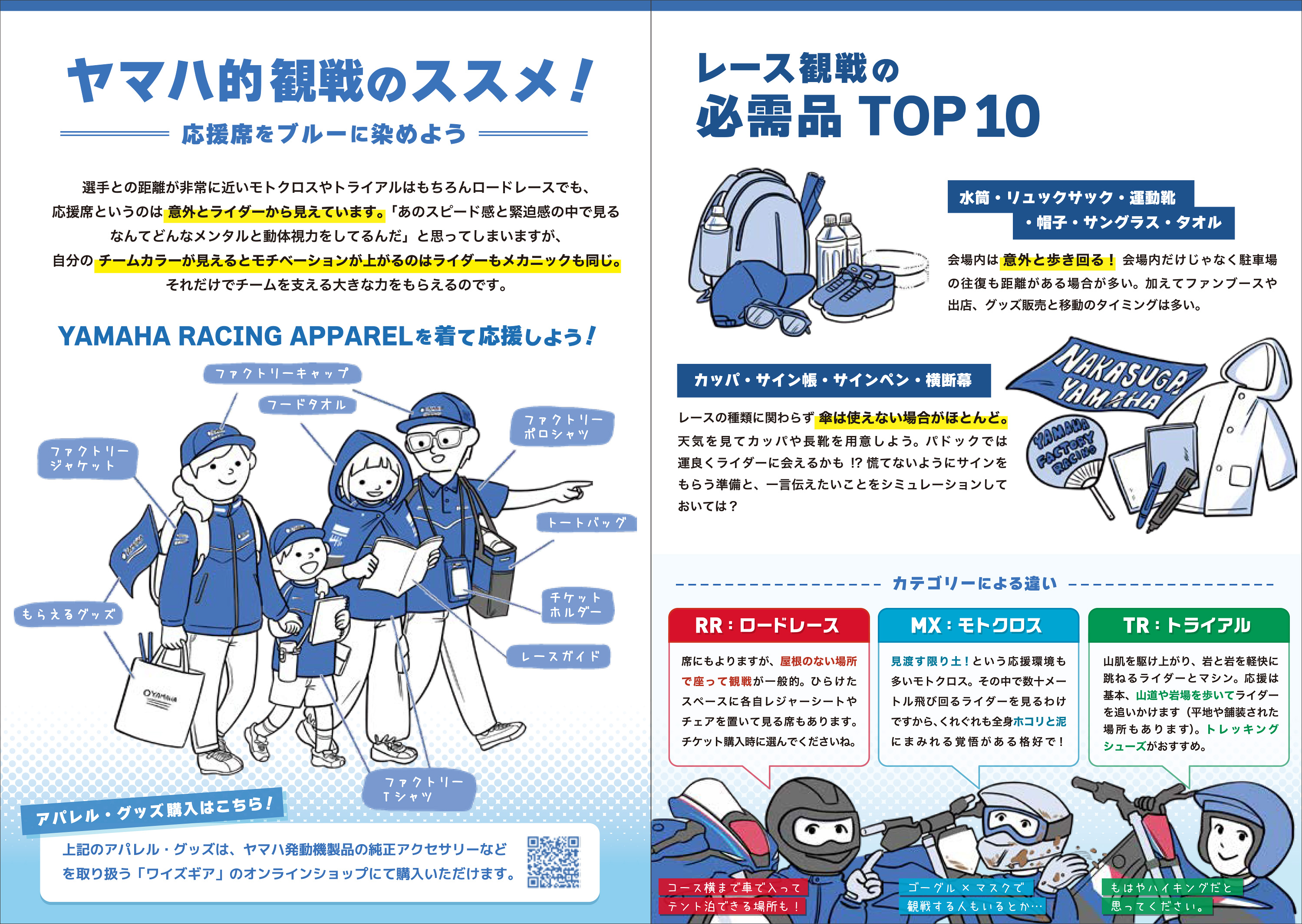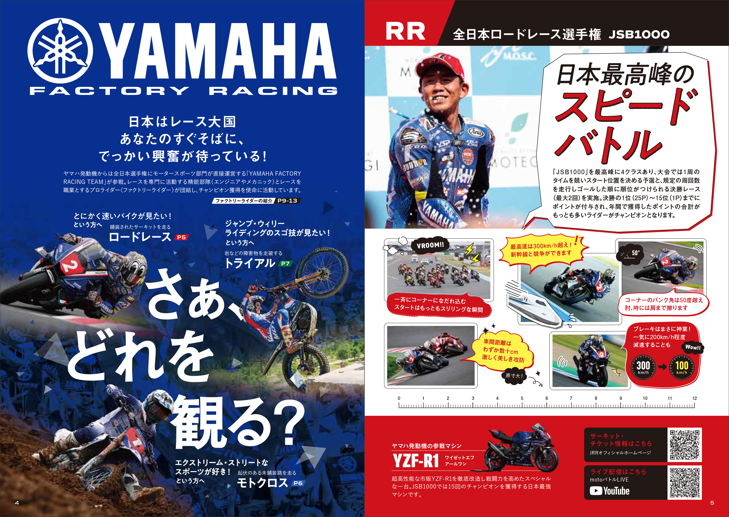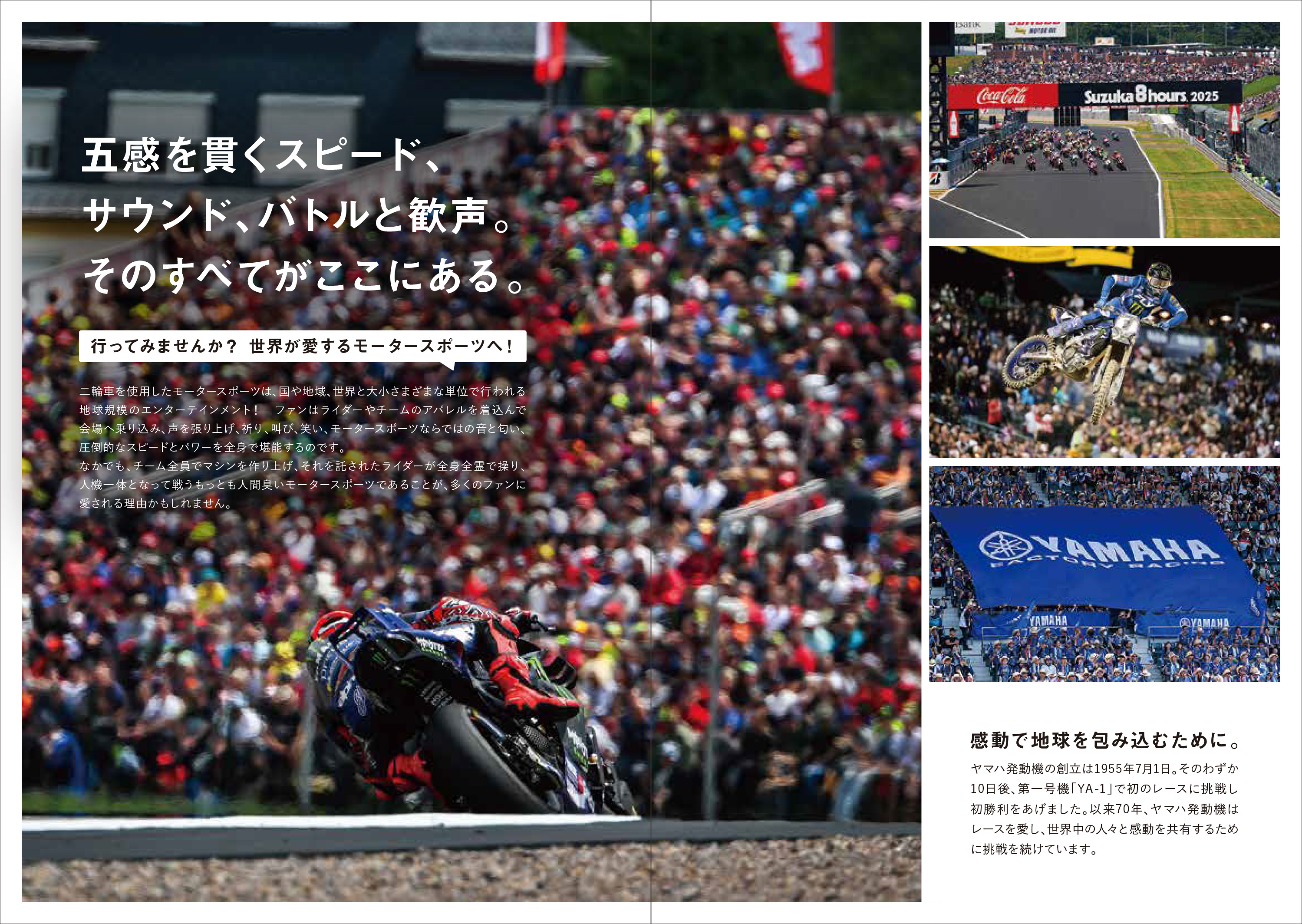 その内容は、全日本選手権として行われている「ロードレース」、「モトクロス」、「トライアル」という競技や、そこに参戦するヤマハライダーたちの紹介。レース観戦での必需品や楽しみ方などの基本情報を掲載しています。