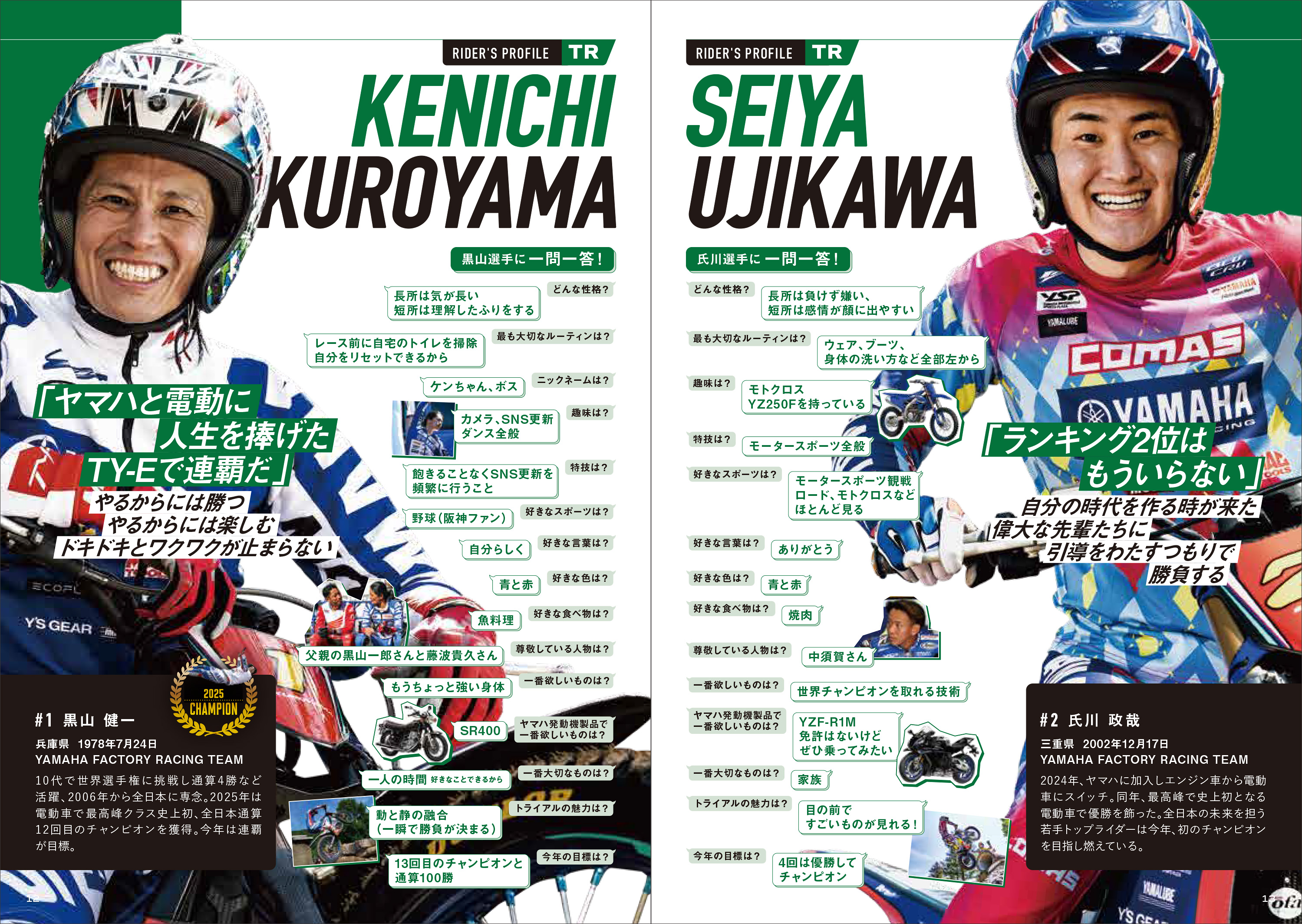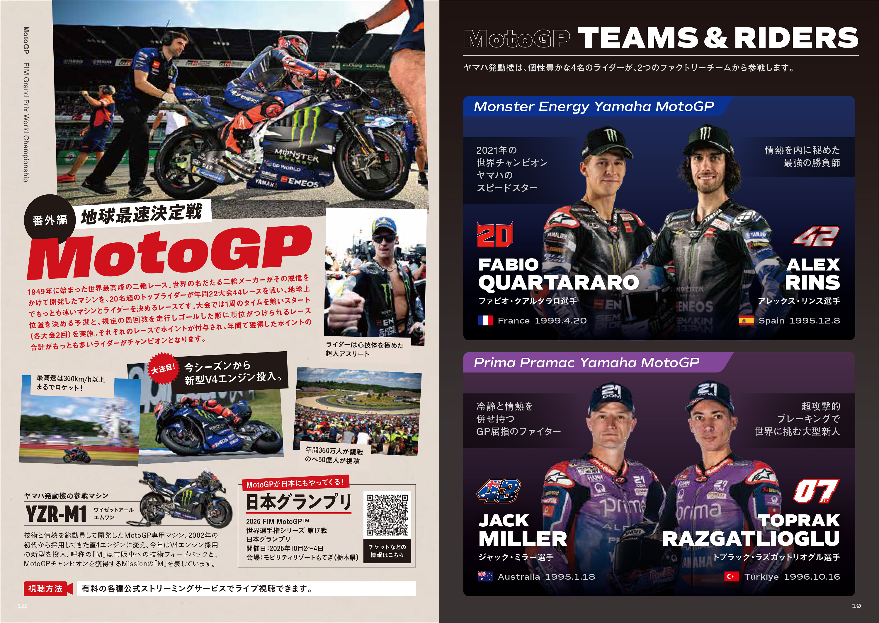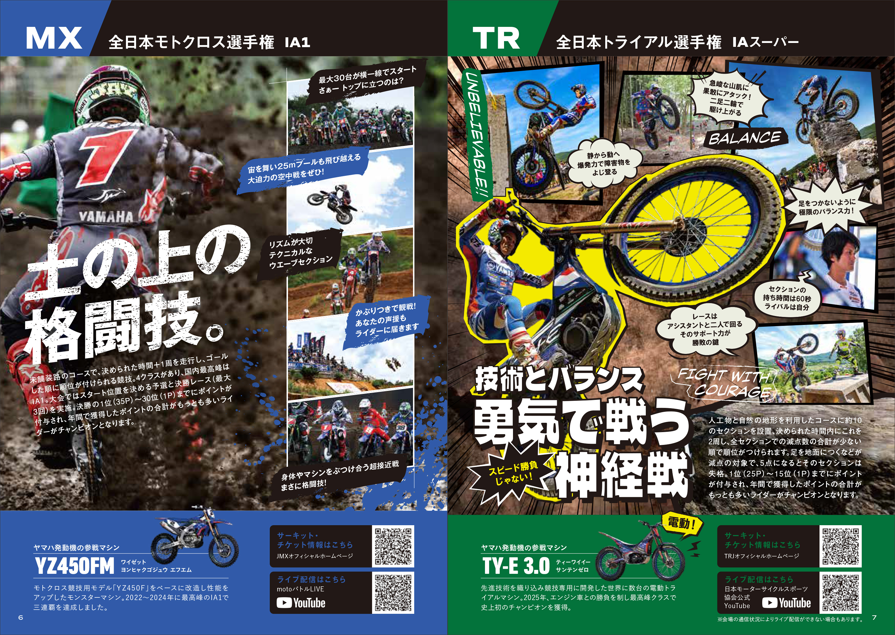 その内容は、全日本選手権として行われている「ロードレース」、「モトクロス」、「トライアル」という競技や、そこに参戦するヤマハライダーたちの紹介。レース観戦での必需品や楽しみ方などの基本情報を掲載しています。