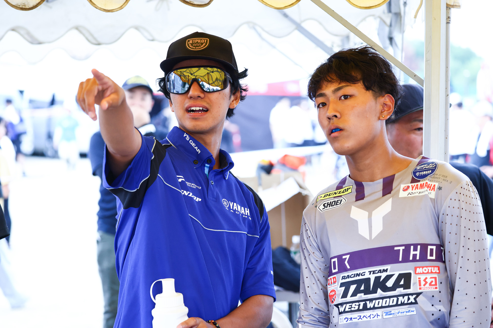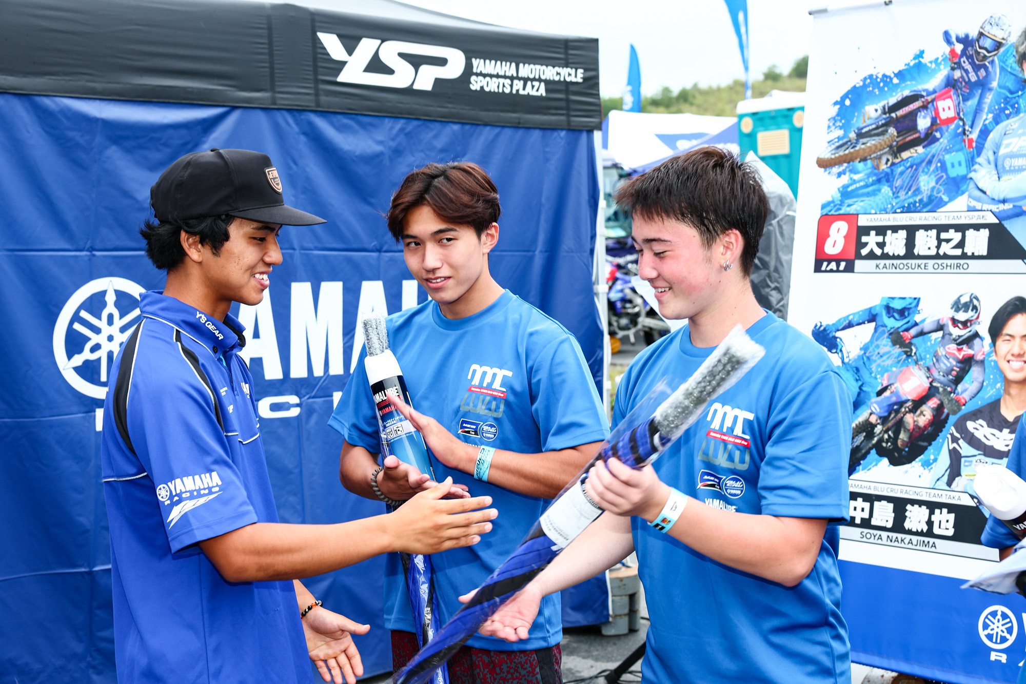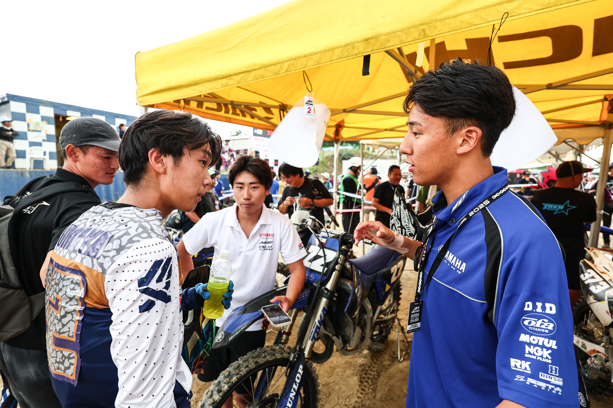 そのグリッドでは、「YAMAHA BLU CRU RACING TEAM」からIA2に参戦し、ランキングトップに立つ中島漱也選手と、ランキング2位の田中淳也選手が激励に登場。特に中島選手はNAやIBではYZ125を駆って力をつけ、昨年にはIA2でチャンピオンに輝いており、ヤングライダーにとっては良きお手本であり、憧れの存在です。そんな彼らがレースに向けてアドバイスをおくるなど、YZ125ライダーたちの背中をおしてレースへと送り出したのです。