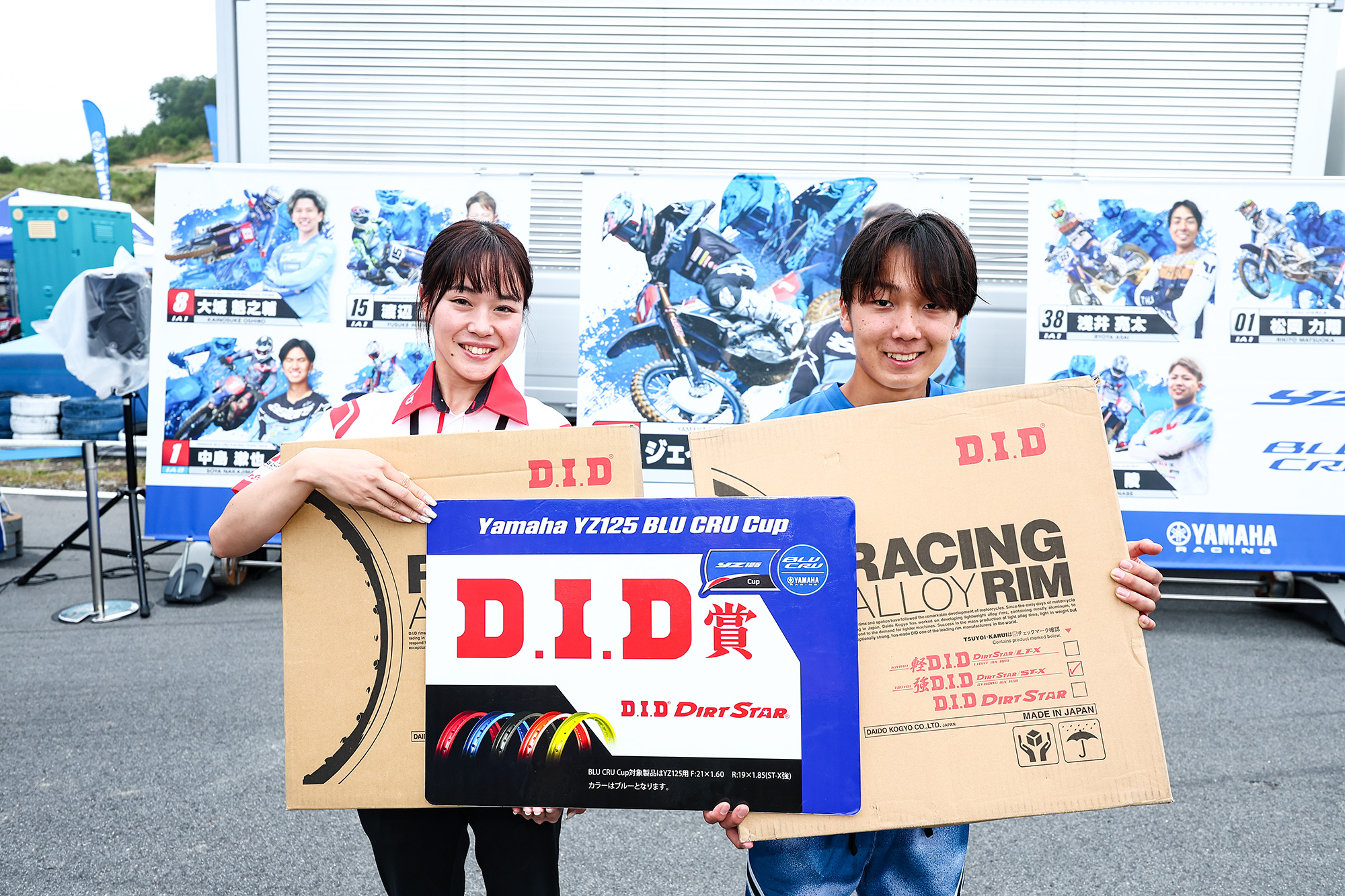 さて、レース終了後は恒例となっている各賞典の贈呈セレモニーを、中島選手をプレゼンターに迎えて開催。1~3 位のライダーにはBLU CRU クーポン(1位〜3・2・1万円分)、4~10 位のライダーにはYAMALUBE賞としてワイズギア製のトートバッグを贈呈。さらに1位となった清宮選手にはD.I.D 賞として 「D.I.D Dirt Star ST-X」前後リム1セットを贈呈しました。さらに参加賞として、YAMALUBEのスーパーブレーキ&オイルクリーナーやYamaha YZ125 BLU CRU Cup オリジナルTシャツをプレゼント。最後は中島選手も交えての記念撮影でセレモニーを終了しました。