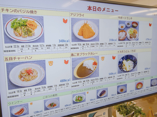 定食(肉・魚)、丼もの、カレー、麺類などからお好きなメニューが選べます。健康に配慮したサポートランチもあり、人気のメニューです。月に数回はスペシャルメニューの日もあり、社員アンケートでは価格・量・質のいずれにおいても高い評価を得ています。