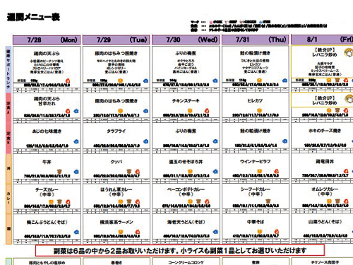 定食(肉・魚)、丼もの、カレー、麺類などからお好きなメニューが選べます。健康に配慮したサポートランチもあり、人気のメニューです。月に数回はスペシャルメニューの日もあり、社員アンケートでは価格・量・質のいずれにおいても高い評価を得ています。