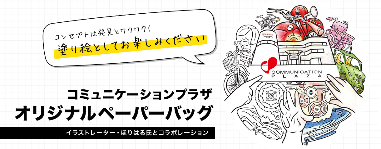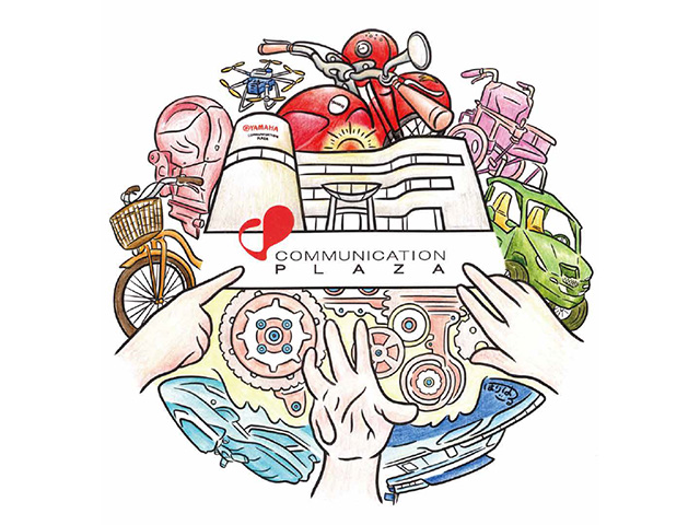 イラストは、“発見とワクワク”をコンセプトに、ヤマハ発動機とお客さまがコミュニケーションプラザを通じてつながっていく姿をイメージしたものです。イラストとして鑑賞するだけでなく、塗り絵としてもお楽しみいただける仕様となっています。