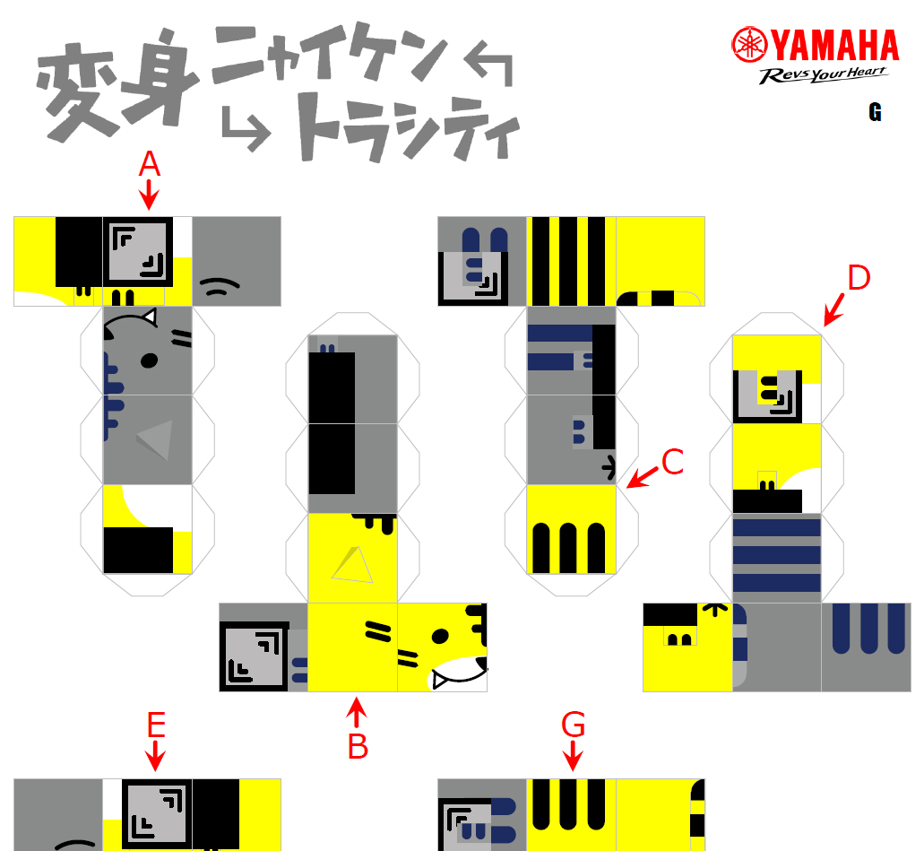 パタパタパタ、わずか3アクションでニャイケンがトラシティに変身するペーパークラフト