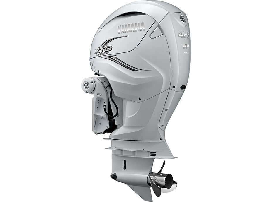 V型8気筒、排気量5,559cm³、最高出力425馬力の新開発のエンジンを採用した船外機。伝統的な「船外機らしさ」「ヤマハらしさ」を継承しながらも、個性的でダイナミックなフォルムを導入し、搭載するボートの外装を引き立てます。