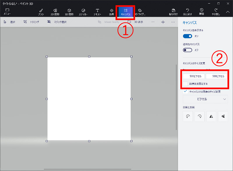 「縦横比を固定する」のチェックを外し、キャンパスのサイズを「幅500ピクセル」「高さ500ピクセル」にします。