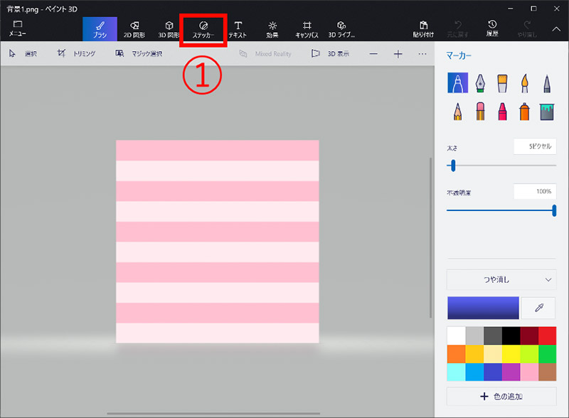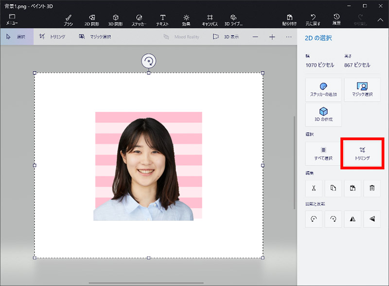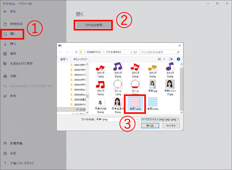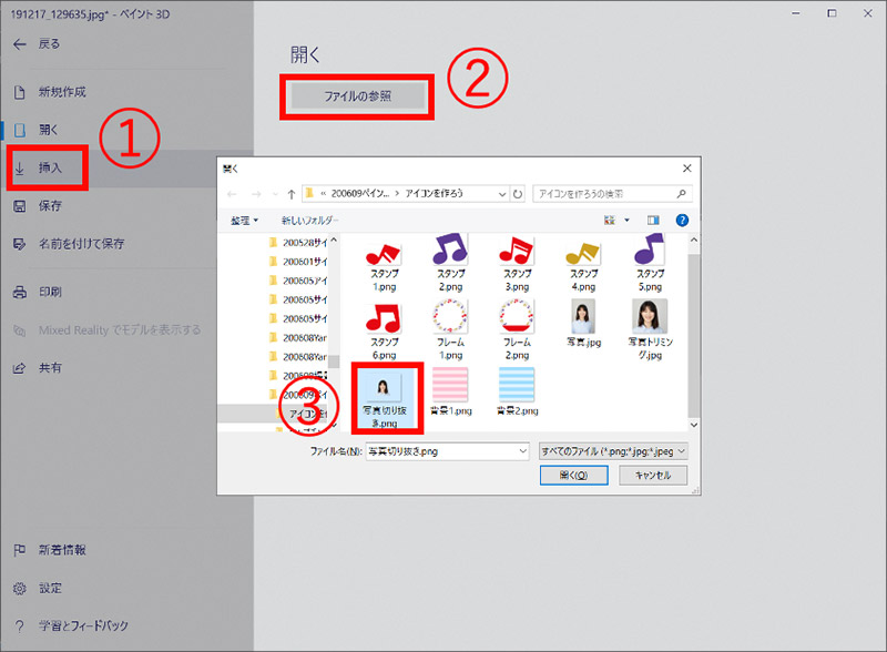 画面左上のメニュー→①挿入→②ファイルの参照から、③「2-1」で切り抜いた写真を選びます。
