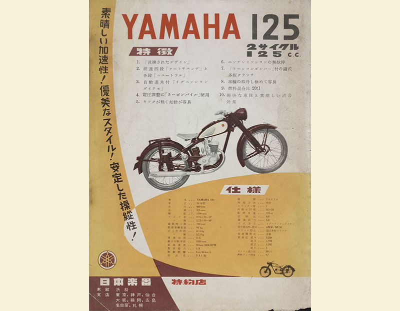 「家電は白、オートバイは黒」が常識だった時代に、ヤマハ第1号製品の125cc「YA-1」は、スリムな車体に華やかなマルーンカラーを纏って市場に送り出された。