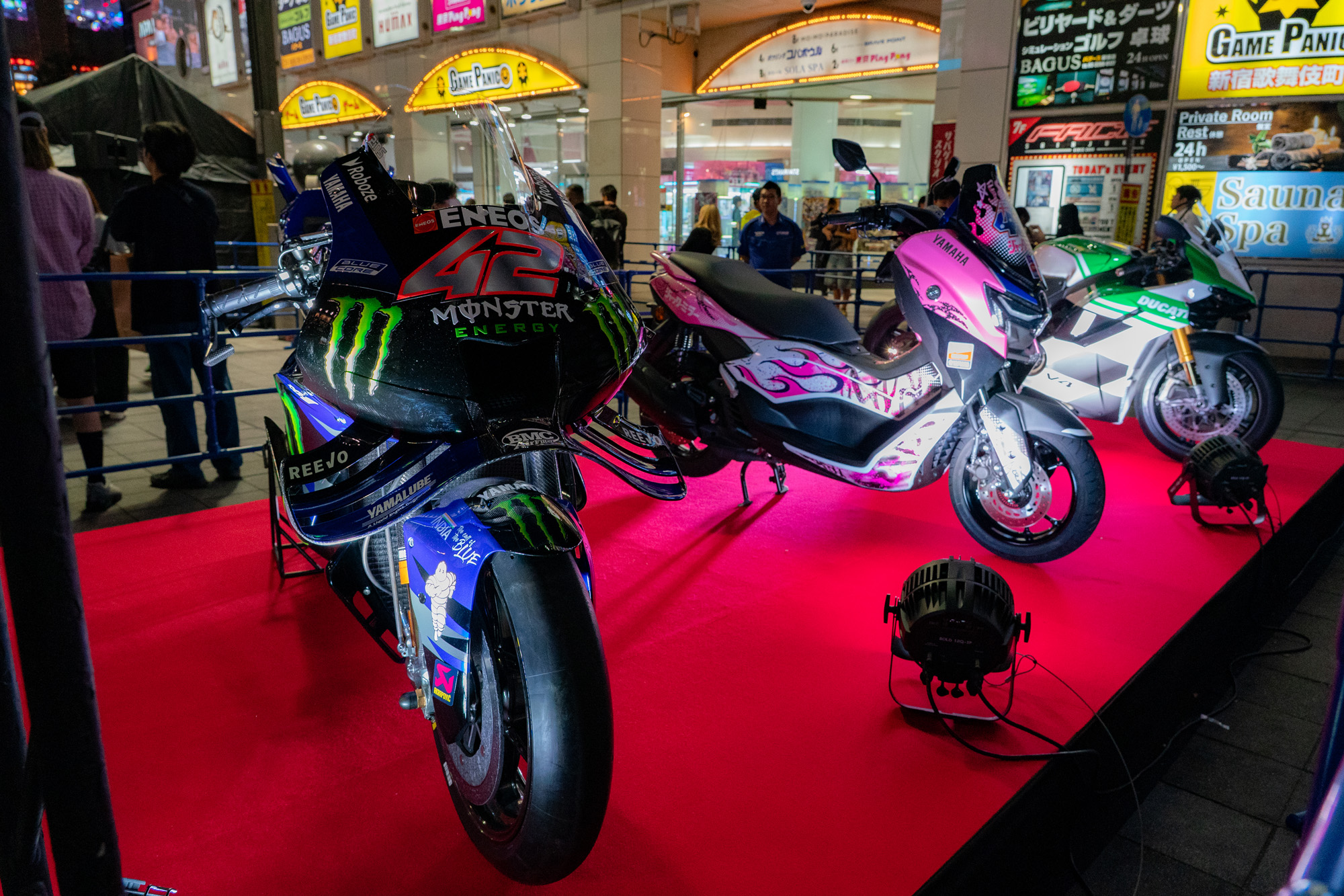 In addition to Yamaha’s YZF-R1 MotoGP machine on display, the venue featured a pink NMAX scooter designed by some of Yamaha Motor’s new hires for the riders to use as paddock scooters for the Japanese GP. The Shinjuku location was chosen to shine a spotlight on motorcycles and motorsport in general, both to existing fans and to passersby in the world’s largest city.