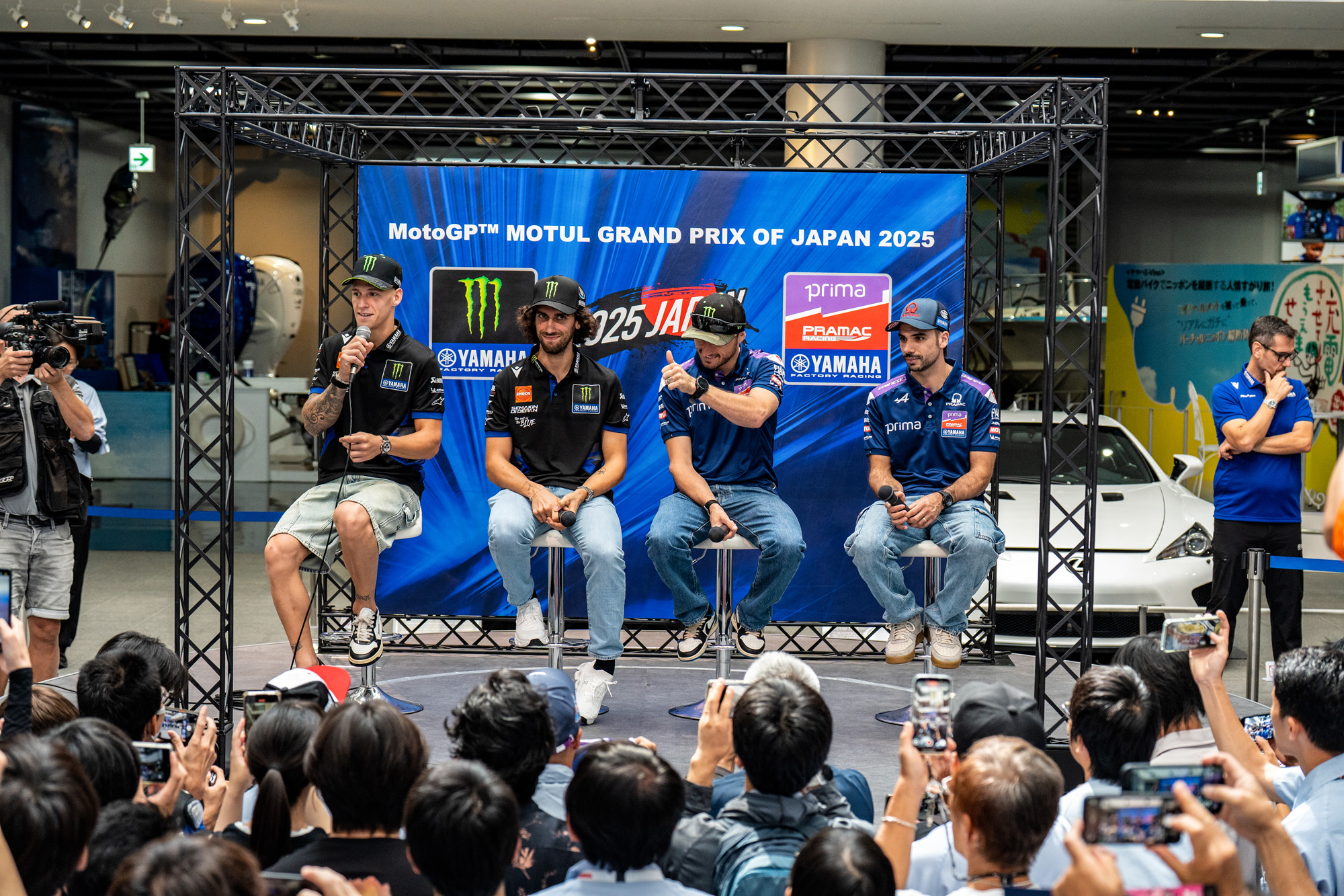 As part of the proceedings at the Japanese Grand Prix, all four Yamaha riders, including Monster Energy Yamaha MotoGP riders Fabio Quartararo and Alex Rins, along with Prima Pramac Yamaha MotoGP riders Jack Miller and Miguel Oliveira, did several promotional events aimed at energizing the fans for the momentous race. Here, we take a look at these activities with several photos, and later on, interviews with the riders. We hope you enjoy it.