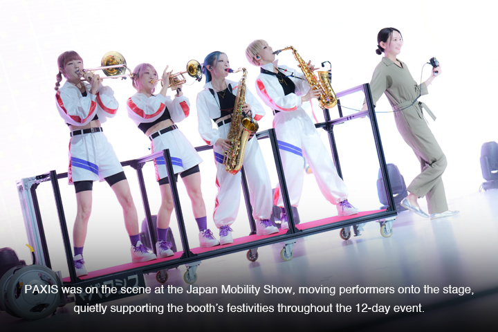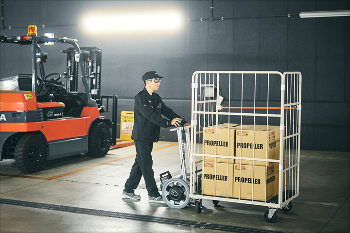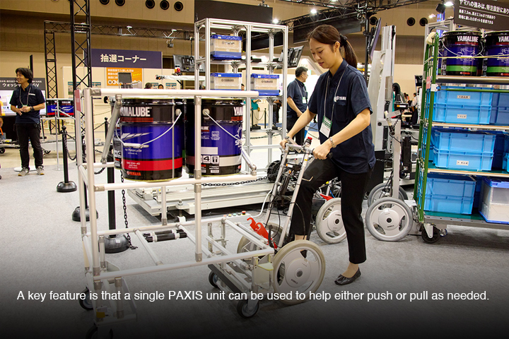 The reason the stagehand on the right was able to pull the cart with MOS performing on it with just one hand was thanks to PAXIS, an electrically power-assisted cargo unit. PAXIS is a tool for aiding transport duties and utilizes the drive unit from our JW Series of electric wheelchairs. It helps reduce physical workload for moving various heavy items and is a solution that has been at work in our logistics warehouses for some 20 years. Today, more than 50 units are in use, including in our factories.