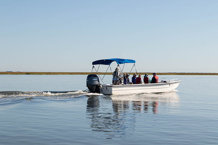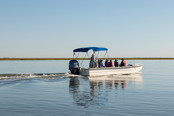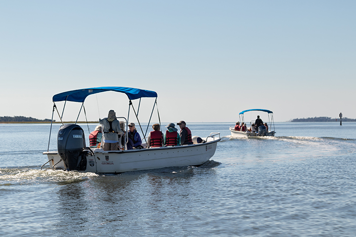 UGA Marine Extension and Georgia Sea Grant’s vessels serve as vital platforms for hands-on learning, coastal research, and community engagement. Marine educators use the vessels to take school groups and visitors to Georgia’s largely undeveloped barrier islands, where participants explore the islands’ role in buffering coastal communities from storms and hurricanes. The skiffs also support research and outreach initiatives, from building oyster reefs with recycled shell and sampling estuarine fish populations to monitoring water quality and conducting marine debris cleanups.