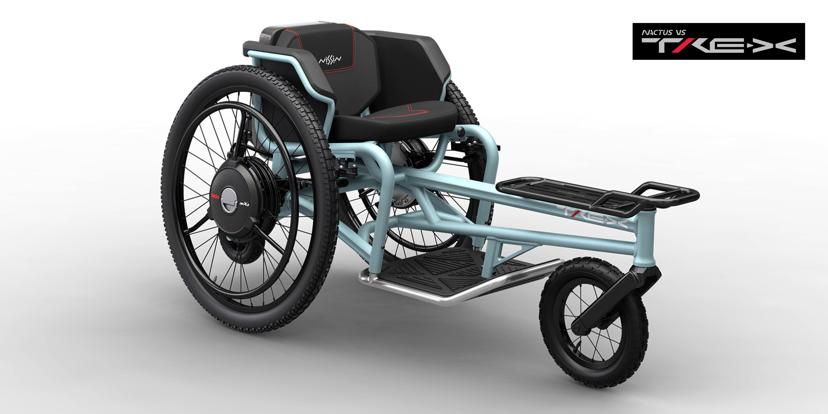 The NACTUS VS TRE-X is a three-wheeled electric wheelchair concept model equipped with the JWX-2 electric power-assist unit. Its striking 26-inch off-road mountain bike tires deliver excellent performance, while the stability unique to a three-wheeled design ensures comfortable travel even across rough terrain and unpaved paths where conventional wheelchairs often struggle. In addition to its straight, center-aligned frame that combines rigidity with elegance, the NACTUS VS TRE-X is outfitted with numerous practical features, such as a front carrier rack, a waterproof battery case, and a spacious footboard.