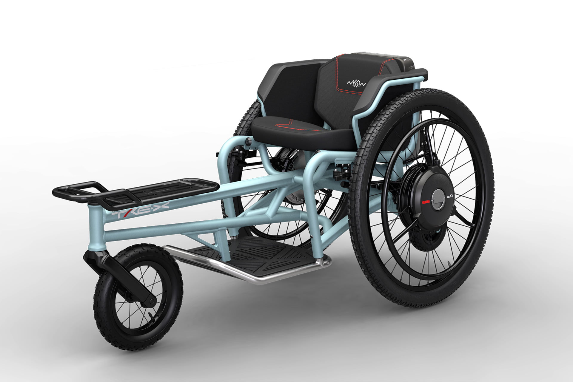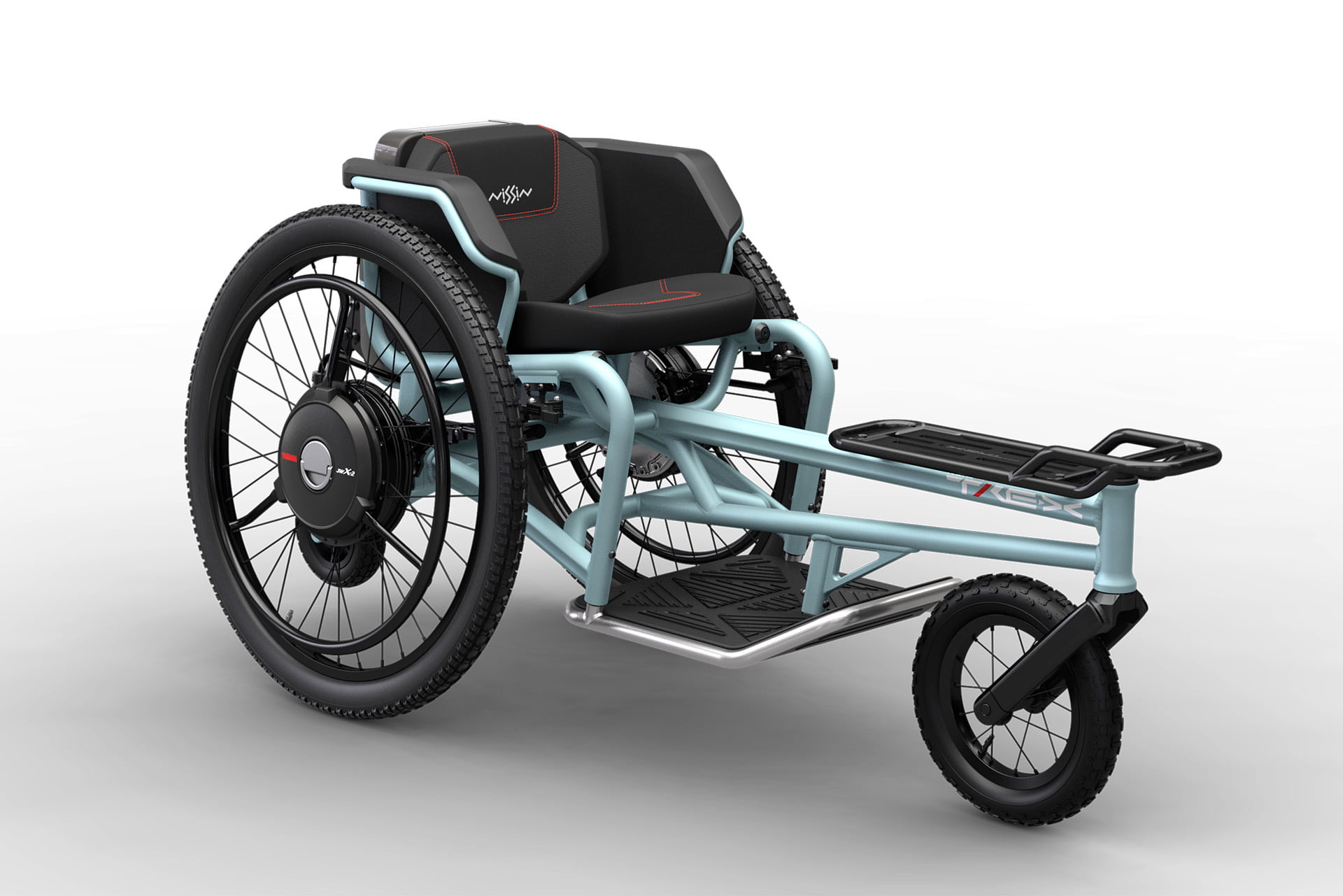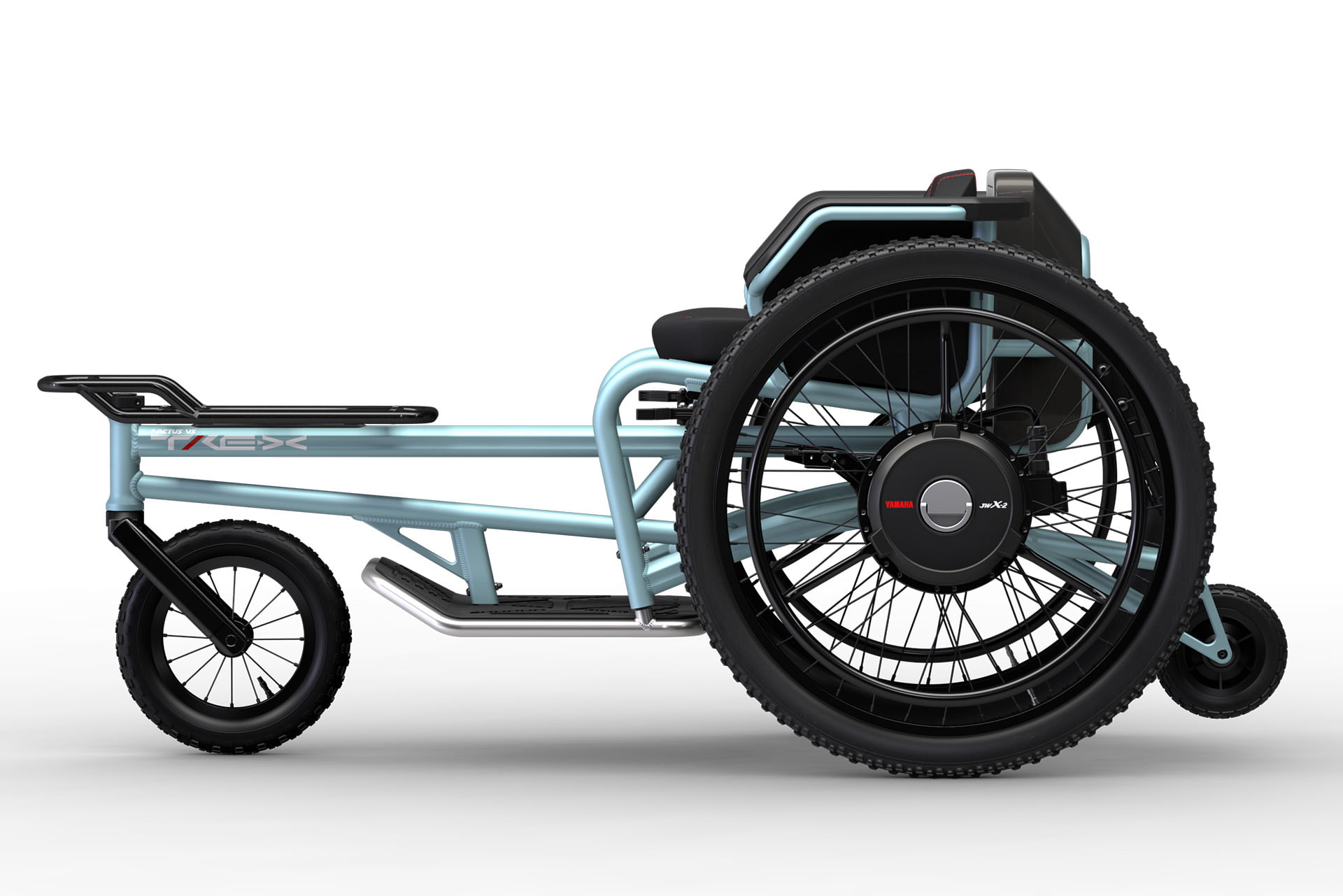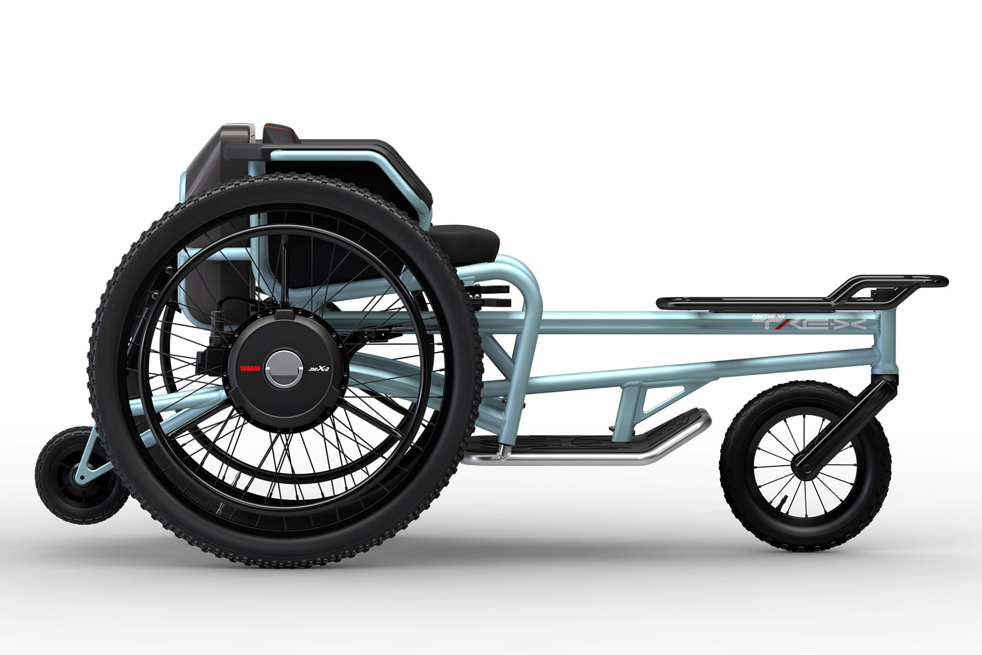 The NACTUS VS TRE-X is a three-wheeled electric wheelchair concept model equipped with the JWX-2 electric power-assist unit. Its striking 26-inch off-road mountain bike tires deliver excellent performance, while the stability unique to a three-wheeled design ensures comfortable travel even across rough terrain and unpaved paths where conventional wheelchairs often struggle. In addition to its straight, center-aligned frame that combines rigidity with elegance, the NACTUS VS TRE-X is outfitted with numerous practical features, such as a front carrier rack, a waterproof battery case, and a spacious footboard.