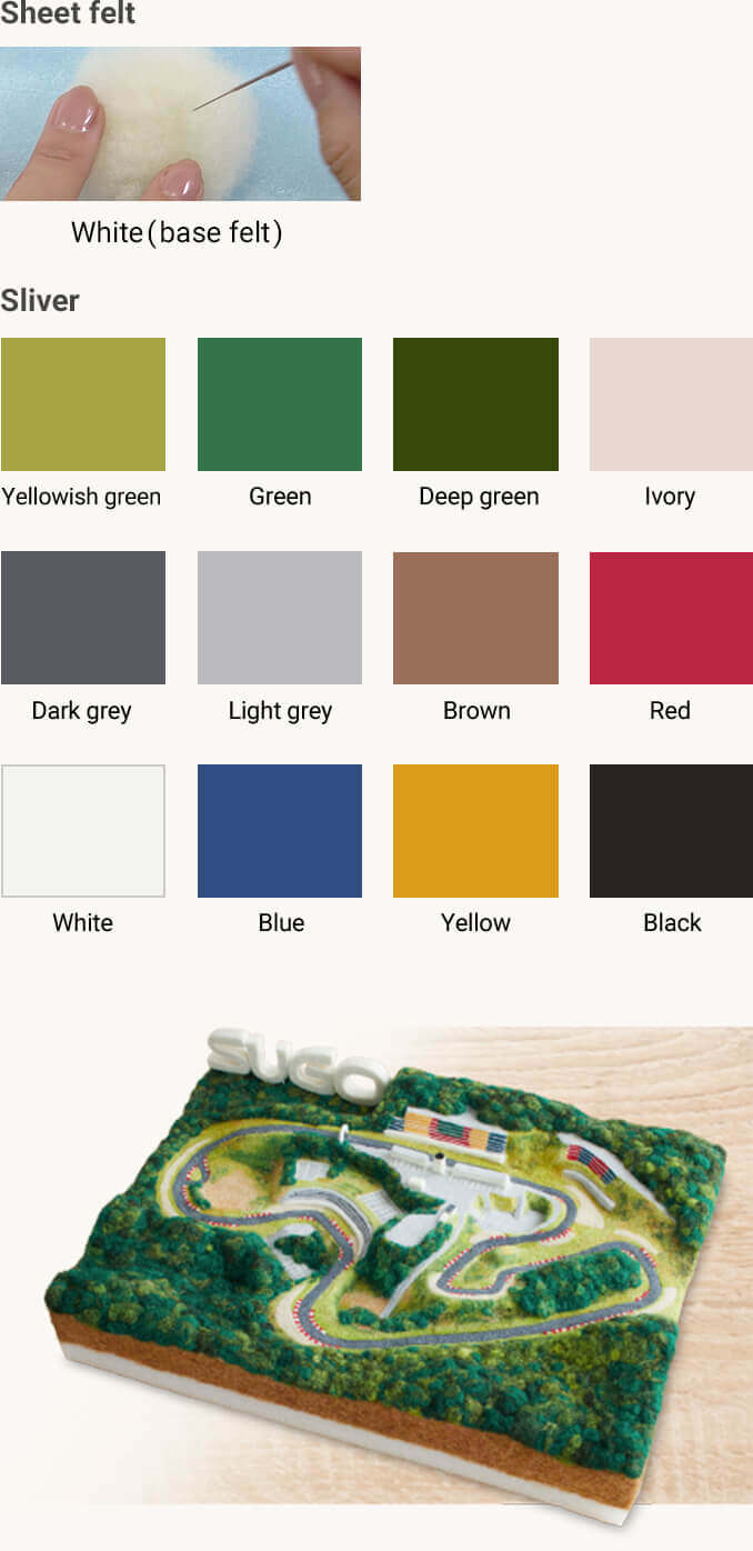 Please prepare the following colours of felt for making the Sportsland SUGO diorama.